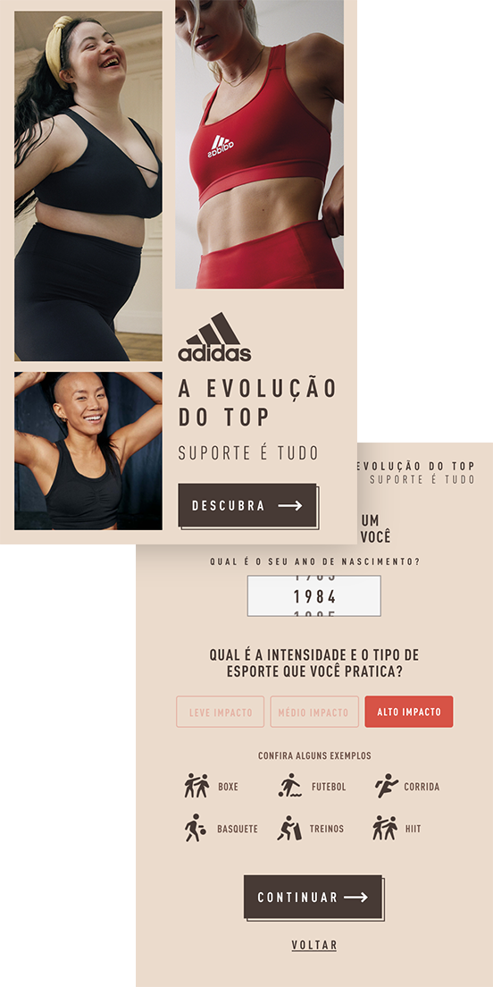A aplicação web desenvolvida para Adidas em parceria com a agência Integer\OutPromo contava com uma consulta personalizada para cada tipo de mulher que buscava por um top para diversos fins. A aplicação ficou em pontos de venda da marca auxiliando o usuário e gerando leads qualificados. outpromo|adidas