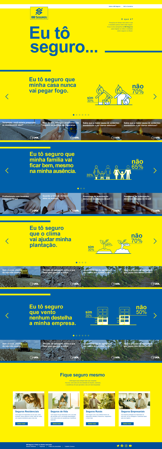 Hotsite desenvolvido para BB Seguros com contagem de porcentagem conforme cliques e desempenhos de campanhas de mídia de banners em diversos portar. O hotsite ainda contou com uma segunda etapa com uma página interna no portal UOL onde os números também eram visíveis aos usuários. c3c|bb seguros