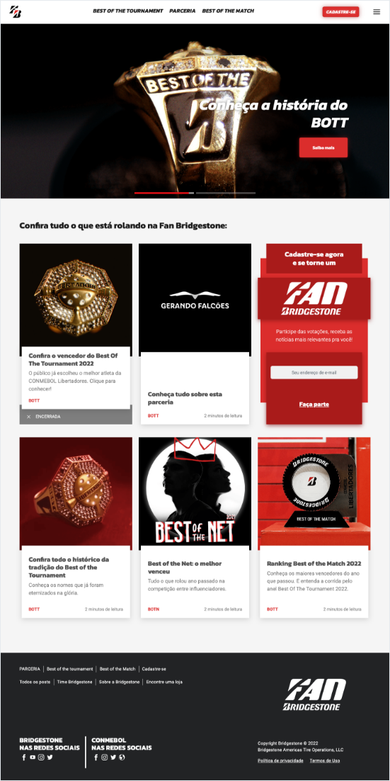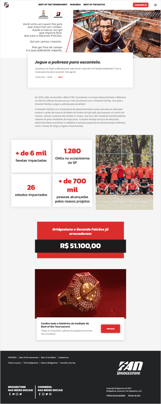 Plataforma de esportes da Bridgestone desenvolvida pela Attinge em parceria a agência VMLY&R. No portal os fãs podem participar da votação oficiais de campeonatos. Realizar doações as campanhas sociais apoiadas pela marca. Acompanhar as ações da marca com influenciadores. vml&r|bridgestone
